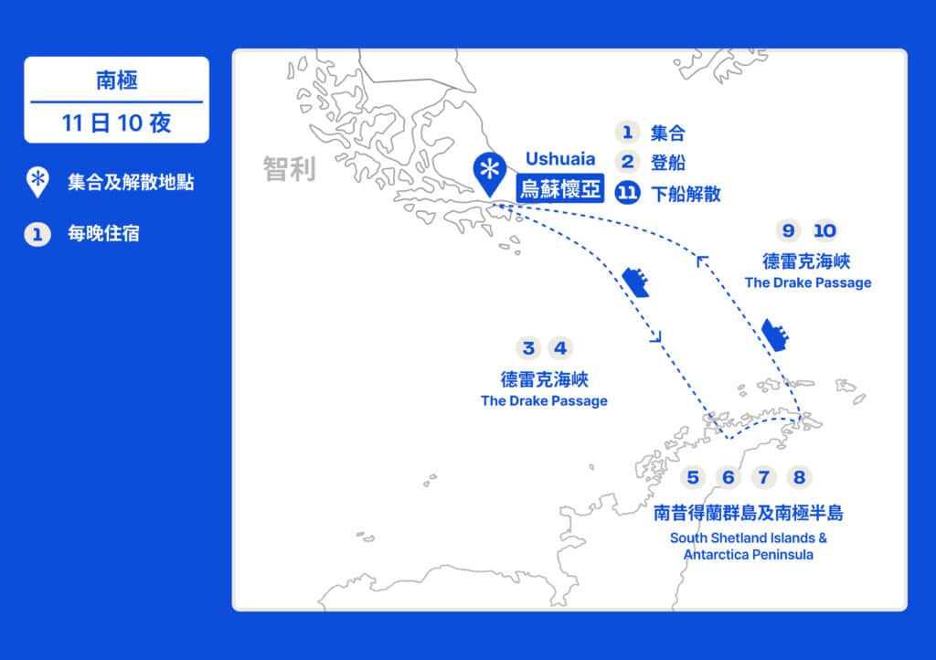 DeWonder Travel 的南極深度遊行程為期 11 日 10 夜,從阿根廷烏蘇懷亞出發,登上極地探險郵輪,深入探索南極半島與南昔得蘭群島,旅程包含: