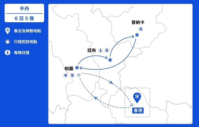 香港 (Hong Kong) → 帕羅 (Paro) → 廷布 (Thimphu) → 普納卡 (Punakha) → 廷布 (Thimphu) → 帕羅 (Paro) → 香港 (Hong Kong)