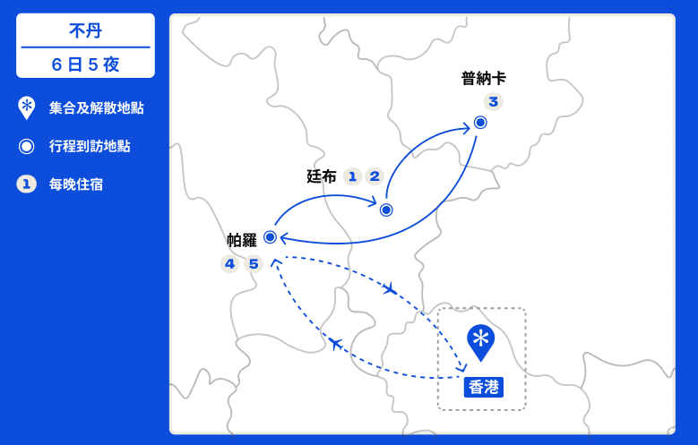 香港 (Hong Kong) → 帕羅 (Paro) → 廷布 (Thimphu) → 普納卡 (Punakha)→ 帕羅 (Paro) → 香港 (Hong Kong)