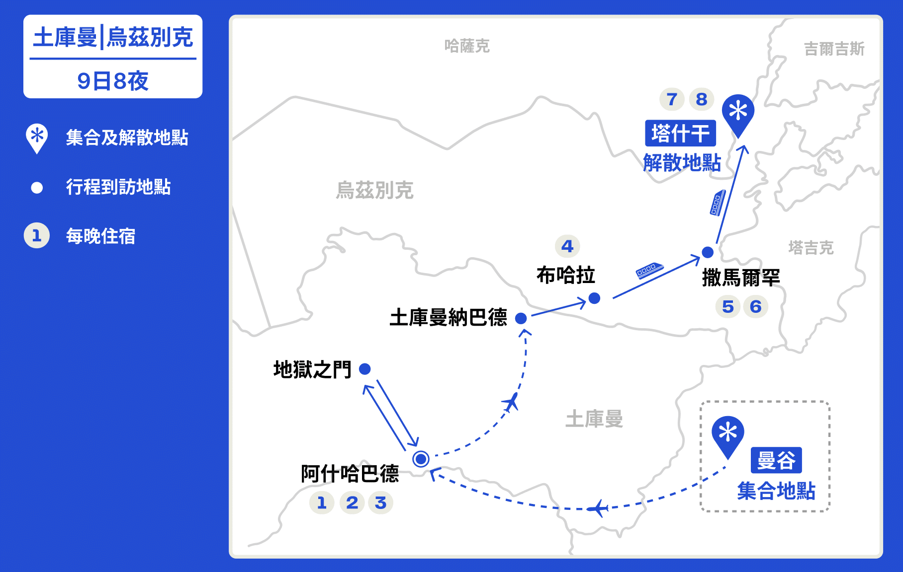 曼谷 (Bangkok) → 阿什哈巴德 (Ashgabat) → 卡拉庫姆沙漠 (Karakum Desert) → 阿什哈巴德 (Ashgabat) → 土庫曼納巴德 (Turkmenabat) → 布哈拉 (Bukhara) → 撒馬爾罕 (Samarkand) → 塔什干 (Tashkent)
