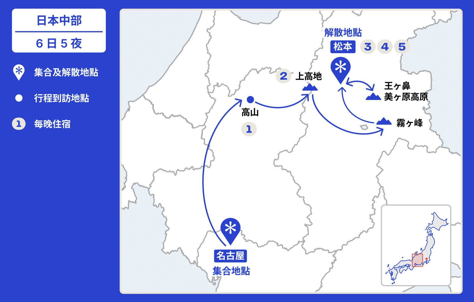 名古屋 (Nagoya) → 高山 (Takayama) → 上高地 (Kamikōchi) → 霧ヶ峰車山 (Kurumayama) → 松本 (Matsumoto) → 王ヶ鼻、美ヶ原高原 (Ogahana, Utsukushigahara) → 松本 (Matsumoto)