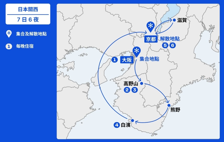 大阪 (Osaka) → 高野山 (Mount Koya) → 熊野古道 (Kumano Kodō) → 熊野 (Kumano) → 京都 (Kyoto) → 滋賀 (Shiga) → 京都 (Kyoto)