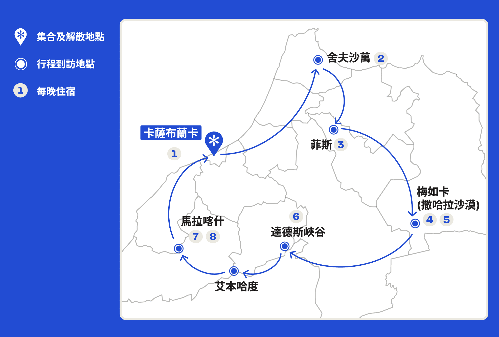 卡薩布蘭卡 (Casablanca) > 舍夫沙萬 (Chefchaouen) > 菲斯 (Fes) > 中阿特拉斯山脈 (Middle Atlas Mountains) > 梅如卡 (Merzouga) > 達德斯峽谷 (Dades Gorge) > 艾本哈度 (Ait Benhaddou) > 馬拉喀什 (Marrakech) > 卡薩布蘭卡 (Casablanca)