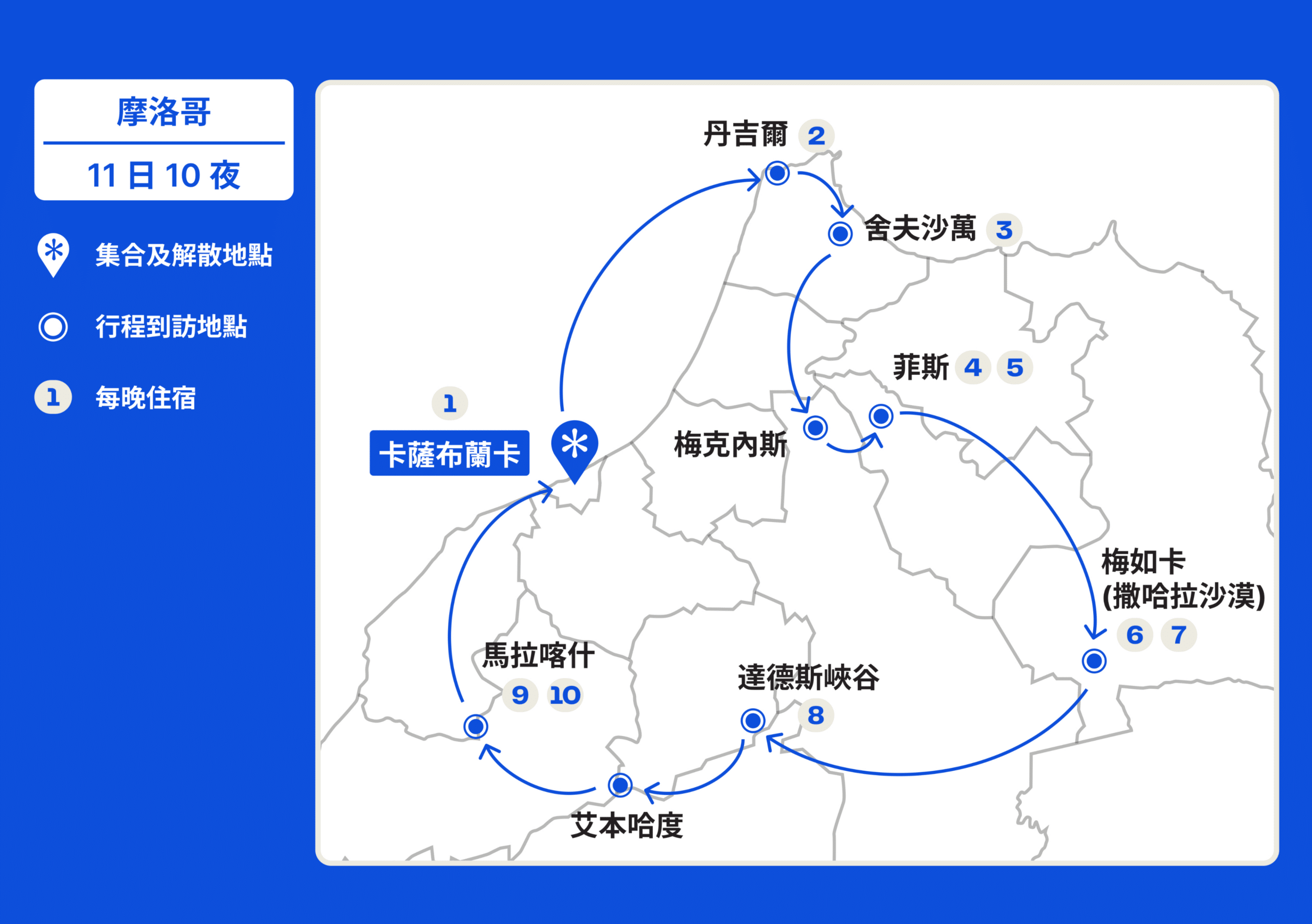 卡薩布蘭卡 (Casablanca) > 丹吉爾 (Tangier) > 舍夫沙萬 (Chefchaouen) > 菲斯 (Fes) > 中阿特拉斯山脈 (Middle Atlas Mountains) > 梅如卡 (Merzouga) > 達德斯峽谷 (Dades Gorge) > 艾本哈度 (Ait Benhaddou) > 馬拉喀什 (Marrakech) > 卡薩布蘭卡 (Casablanca)